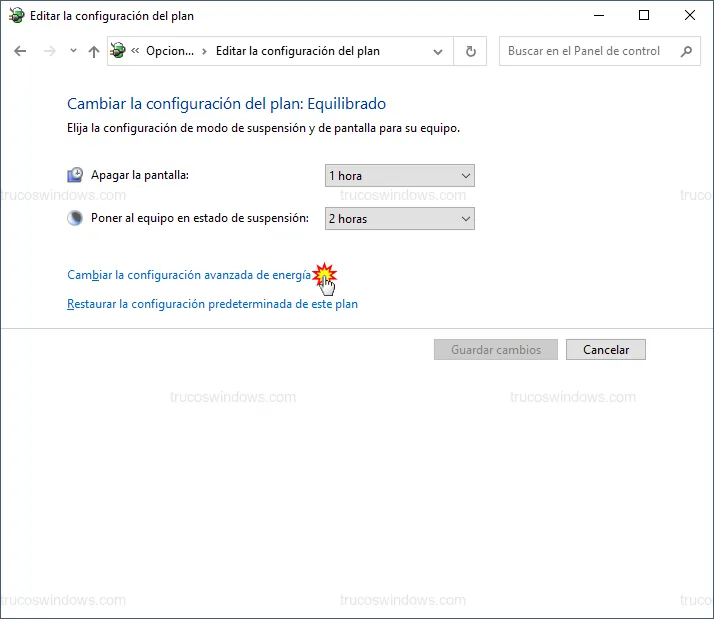 - Dentro de la ventana anterior, pulsa en Cambiar la configuración avanzada de energía.