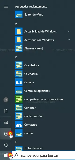 - Haz clic en el botón de Inicio y selecciona el icono de Configuración.