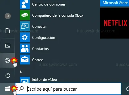 - Haz clic en el botón de Inicio y selecciona el icono de Configuración (representado por un engranaje).