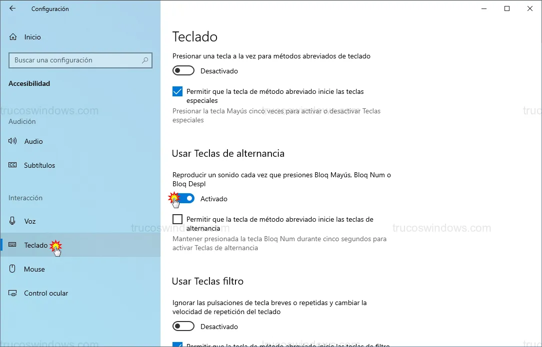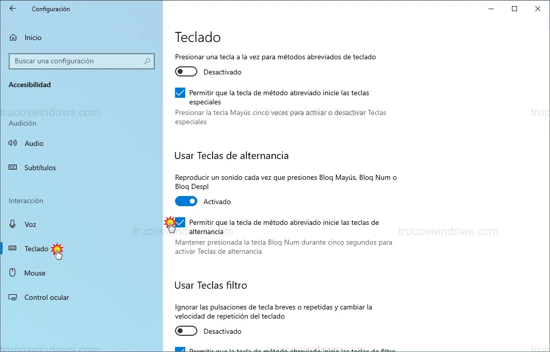 Si deseas activar o desactivar esta característica rápidamente sin entrar en menús, asegúrate de tener marcada la casilla Permitir que la tecla de método abreviado inicie las teclas de alternancia.