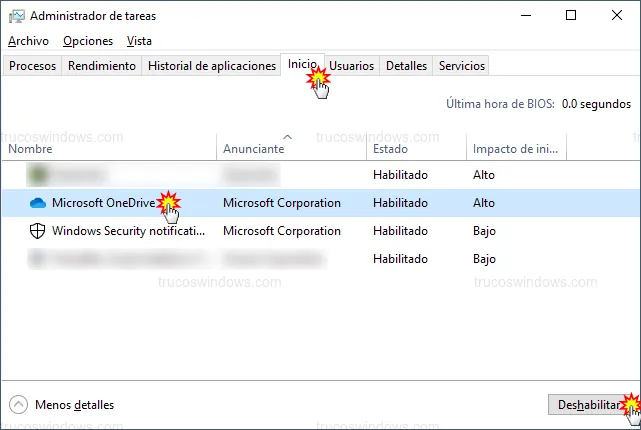 - Una vez en el Administrador de tareas, dentro de la pestaña Inicio, seleccionamos cada elemento de la lista y pulsamos en el botón Deshabilitar.