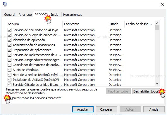 En la ventana de Configuración del sistema, nos desplazamos hasta la pestaña Servicios. Es crucial activar la casilla Ocultar todos los servicios de Microsoft; esto evitará que desabilitemos funciones vitales del sistema operativo. A continuación, hacemos clic en el botón Deshabilitar todos para desactivar únicamente el software de terceros.