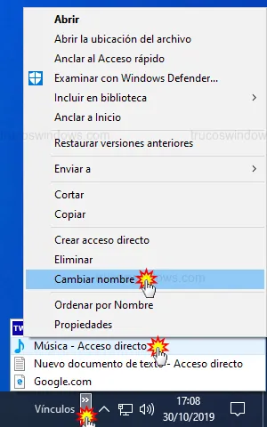 Si necesitas cambiar el nombre de un acceso para que sea más corto o descriptivo, haz clic derecho sobre el elemento dentro del menú desplegable y elige Cambiar nombre.