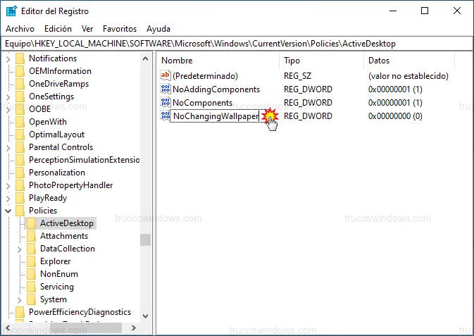 Configuración del valor NoChangingWallpaper