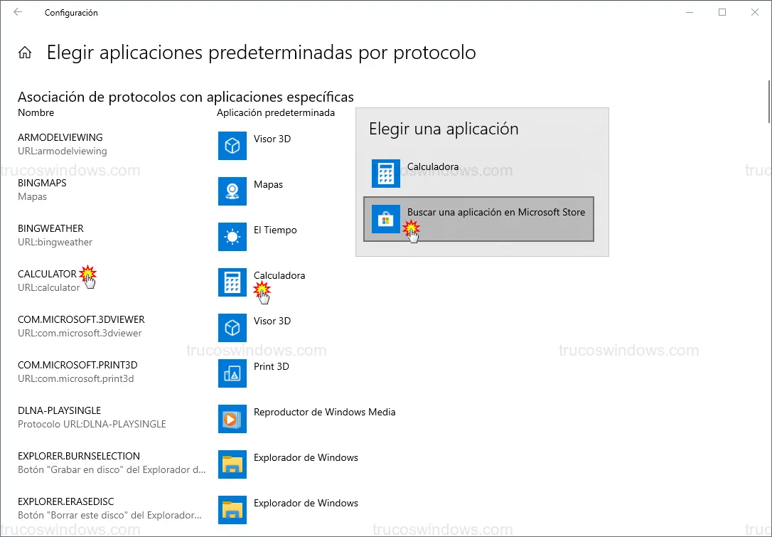 Si deseas cambiar la aplicación que responde a un comando de sistema, busca el protocolo en la lista de la izquierda y selecciona la aplicación deseada a la derecha. Si no tienes una alternativa instalada, Windows te ofrecerá buscar una en la Microsoft Store.