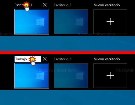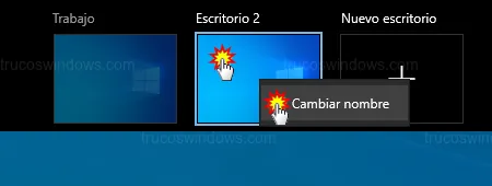 Ahora verás las miniaturas tituladas como Escritorio 1 y Escritorio 2. La manera más rápida de personalizarlos es la siguiente: