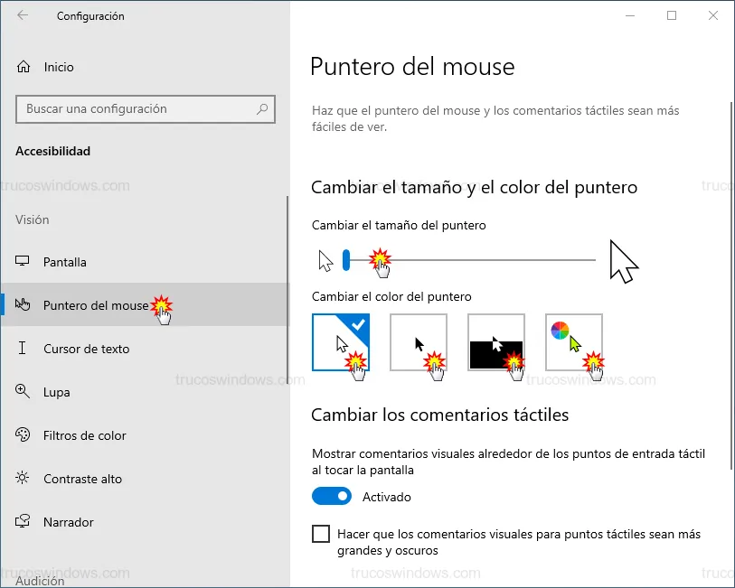 - Cambiar el color del puntero: Dispones de cuatro modos predefinidos: