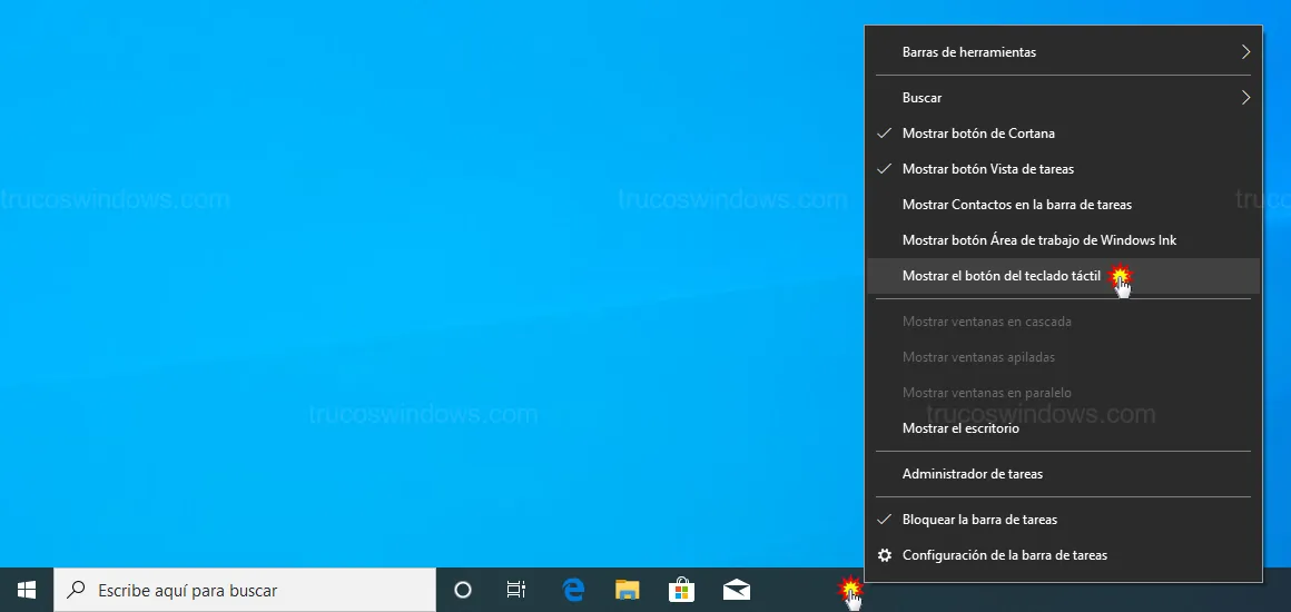 Si prefieres una interfaz más visual o estás utilizando un dispositivo sin teclado físico, puedes habilitar el botón del teclado táctil en la barra de tareas:
