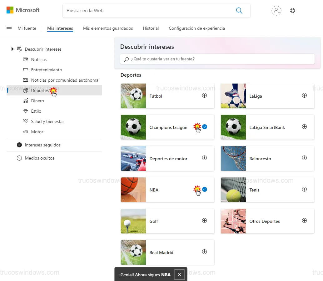 Para que el widget sea realmente útil, debes indicarle al sistema qué temas te apasionan.