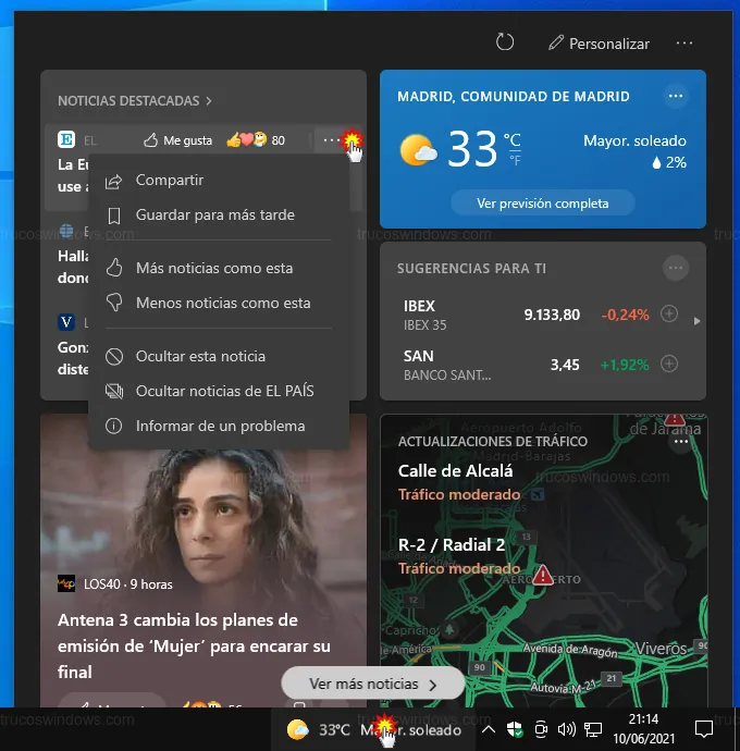 A partir de la actualización KB5003637, Windows 10 integra la información meteorológica directamente en la barra de tareas. Este acceso directo abre el widget de Noticias e intereses, un panel dinámico con tarjetas sobre finanzas, deportes y actualidad.