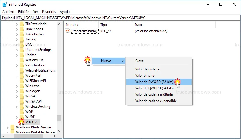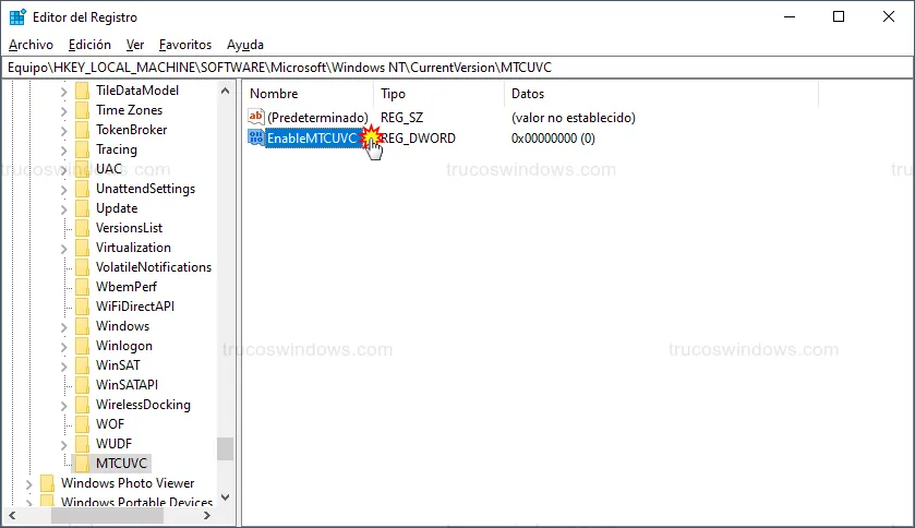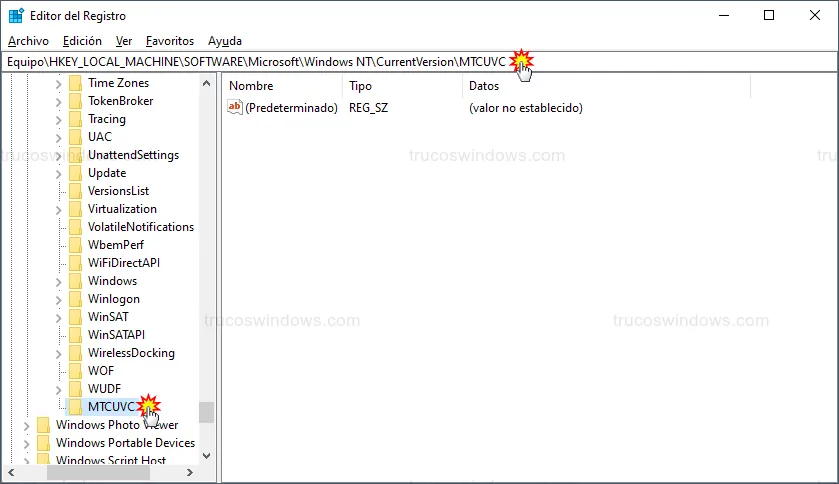 Si al llegar a CurrentVersion no visualizas la carpeta MTCUVC, deberás crearla manualmente: