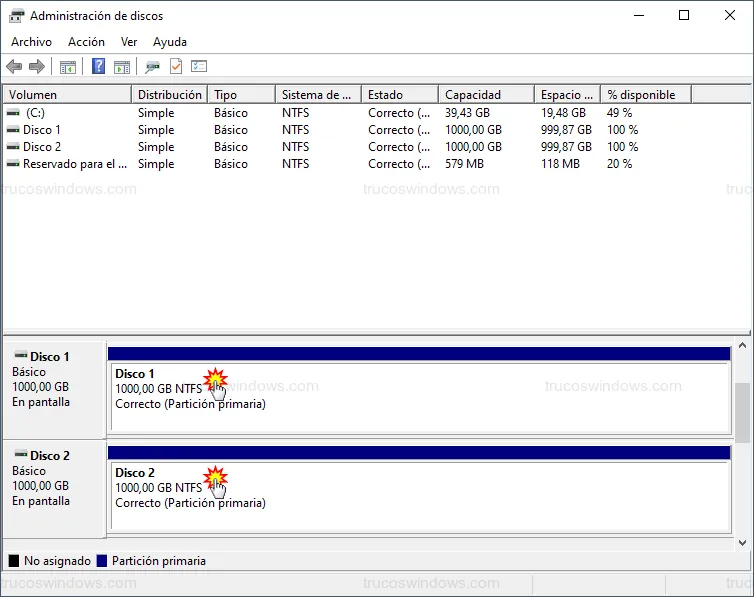 Para crear un RAID 1 efectivo, necesitamos al menos dos unidades de almacenamiento que Windows reconozca correctamente: