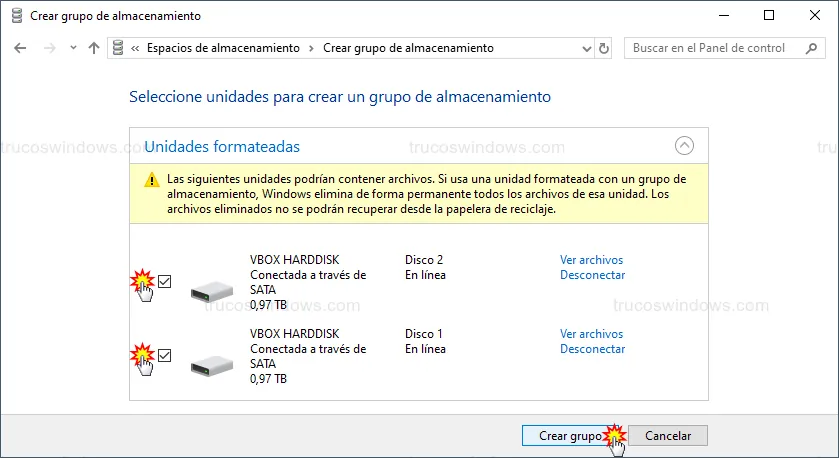 - Marca las casillas de los dos discos duros y pulsa en Crear grupo.
