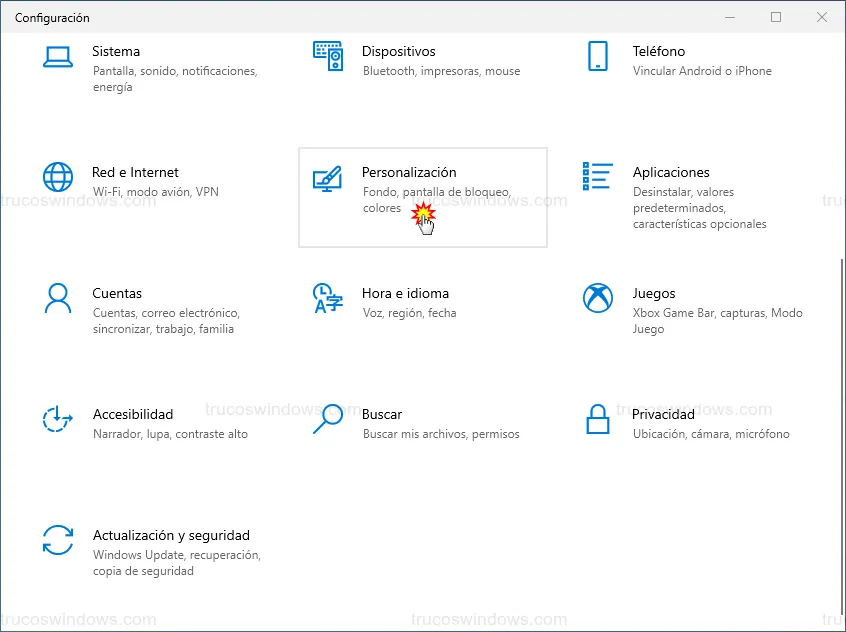 - Dentro de la ventana principal, busca y pulsa sobre la categoría Personalización.