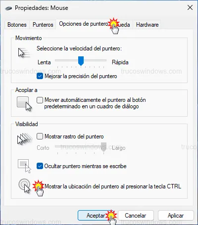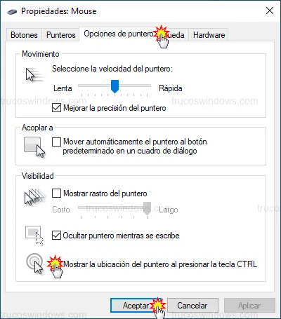 - Marca Mostrar la ubicación del puntero al presionar la tecla CTRL.