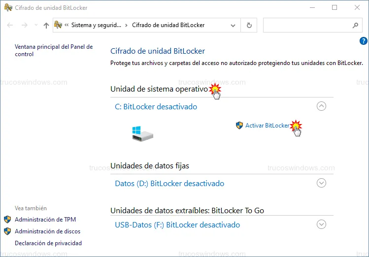 - En Administrar BitLocker, busca Unidades de datos fijas.