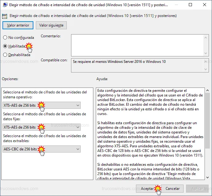 Configuración del equipo > Plantillas administrativas > Componentes de Windows > Cifrado de unidad BitLocker. - Abre Elegir método de cifrado e intensidad (Windows 10 versión 1511 y posteriores).