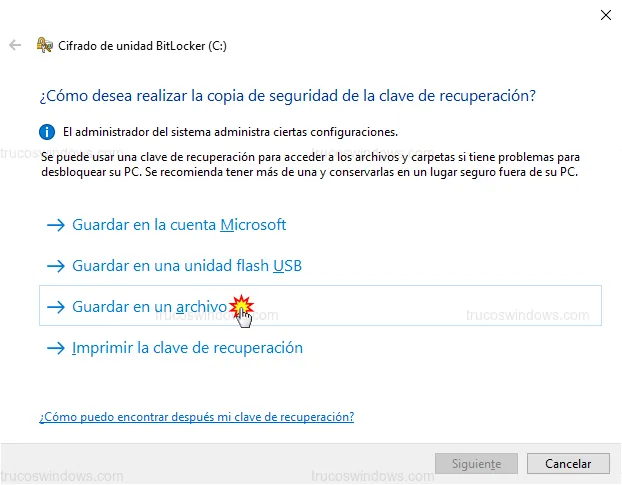 - Crítico: Guarda la clave de recuperación en un archivo externo o imprímela. Nunca la guardes solo en la unidad que vas a cifrar.