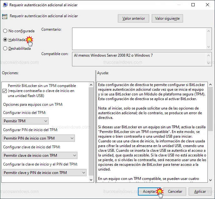 - Asegúrate de que esté marcada la opción Permitir BitLocker sin un TPM compatible.