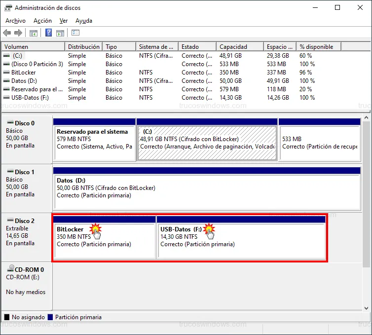 Para proteger un pendrive o disco externo, Windows utiliza BitLocker To Go. Para que sea compatible con cualquier equipo, se recomienda crear una pequeña partición de sistema (350MB) sin cifrar dentro del USB antes de empezar.
