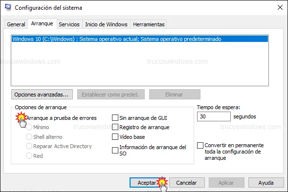 - Ve a la pestaña Arranque y, en el apartado inferior, desmarca la casilla Arranque a prueba de errores.