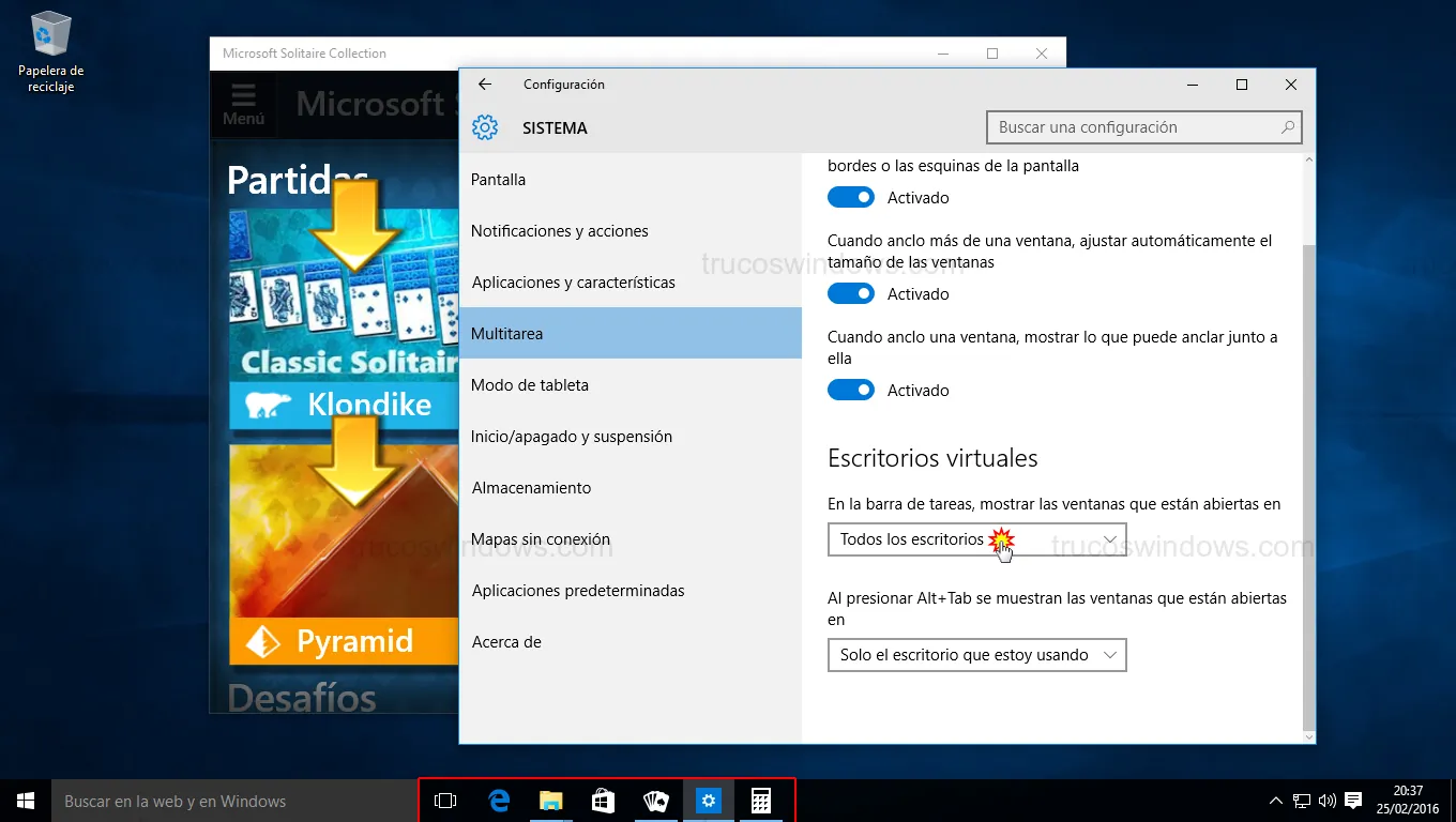- En el apartado Escritorios virtuales, busca la opción "En la barra de tareas, mostrar las ventanas que están abiertas en" y cámbiala a Todos los escritorios.
