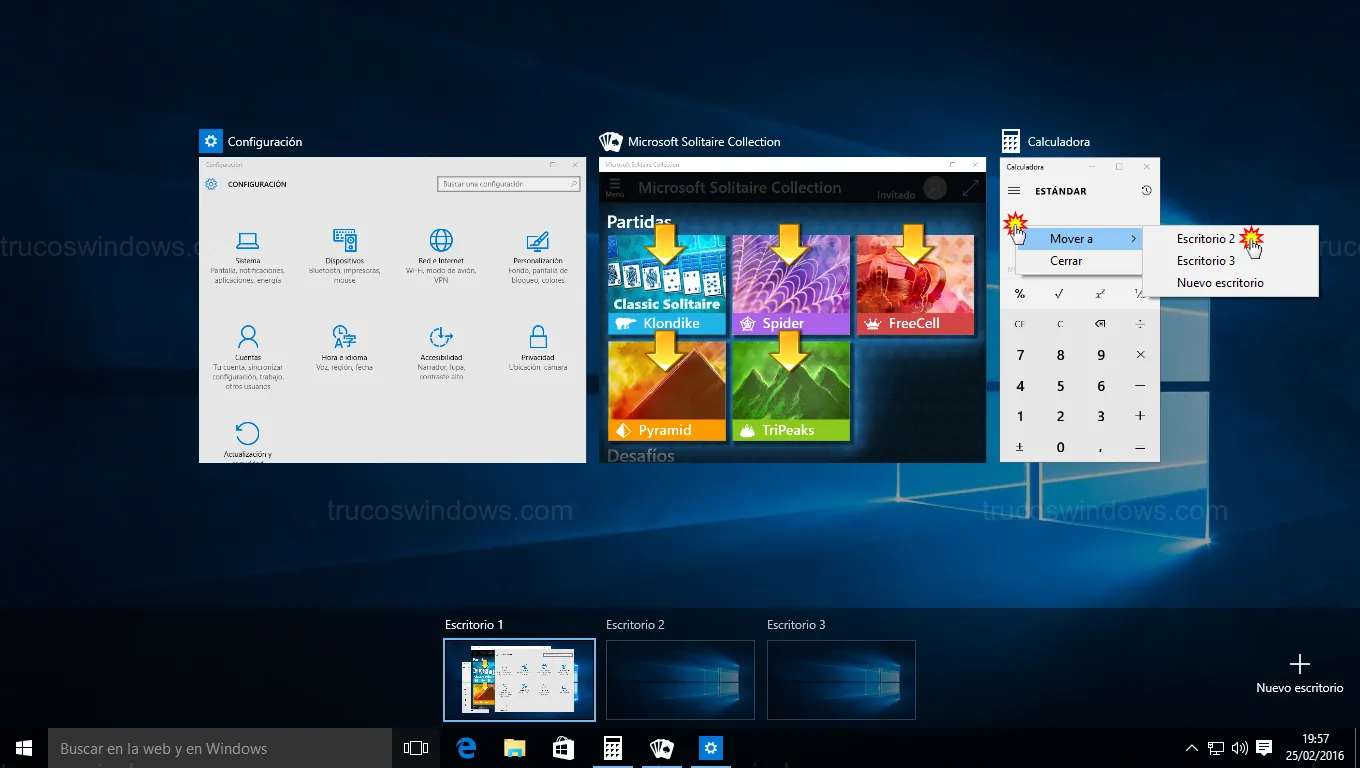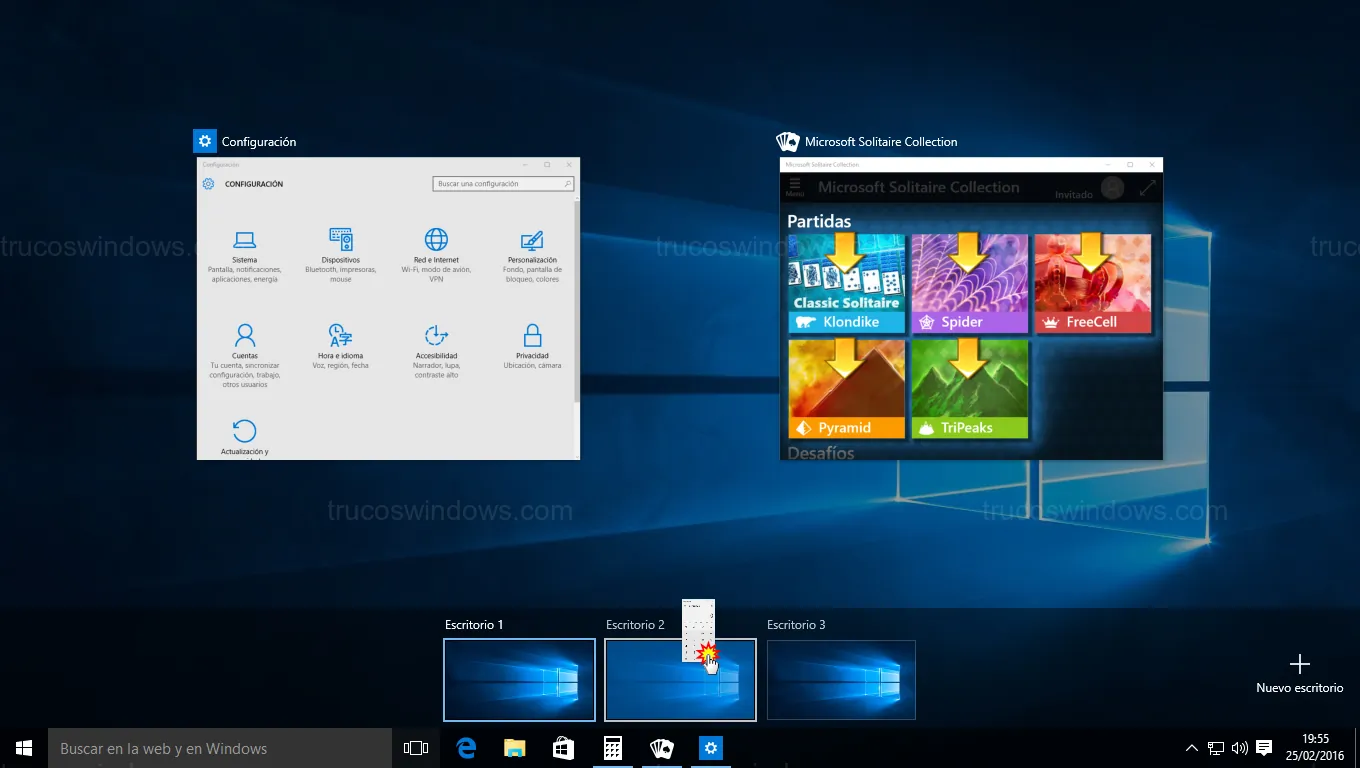 - Arrastrar y soltar: En la Vista de tareas, pincha sobre una ventana y arrástrala hacia la miniatura del escritorio de destino.