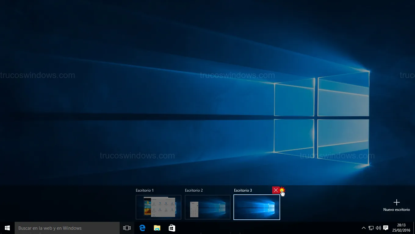 Para eliminar un escritorio, simplemente coloca el cursor sobre su miniatura en la Vista de tareas y haz clic en la X. Si cierras un escritorio que tiene ventanas abiertas, estas se moverán automáticamente al escritorio inmediatamente anterior.