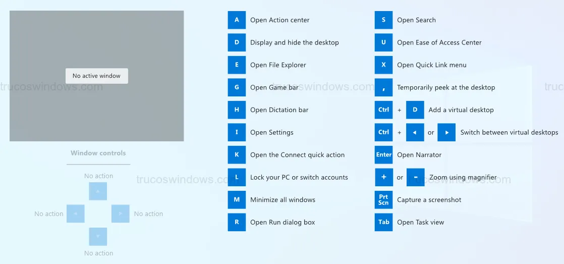 Muestra una guía visual de todos los atajos de teclado disponibles que utilizan la tecla de Windows según el contexto de la aplicación abierta.