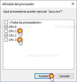 A través de la función de Afinidad, podemos decidir exactamente qué núcleos del procesador debe utilizar un ejecutable. En este ejemplo, limitaremos una aplicación de cuatro núcleos a solo dos.