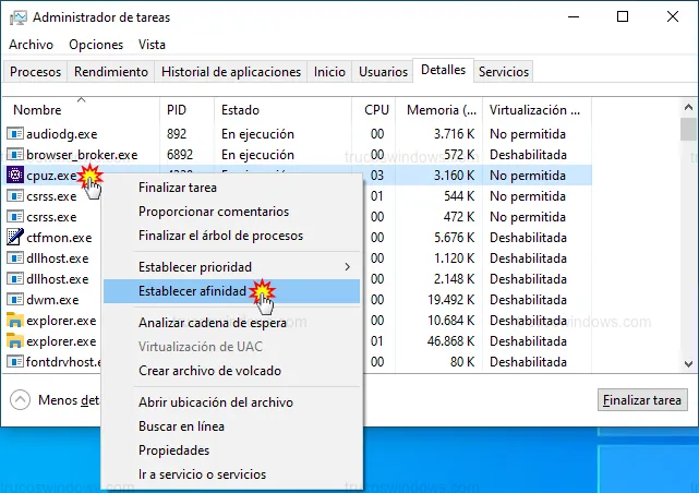cpuz.exe). - Haz clic derecho sobre el proceso y selecciona Establecer afinidad en el menú contextual.