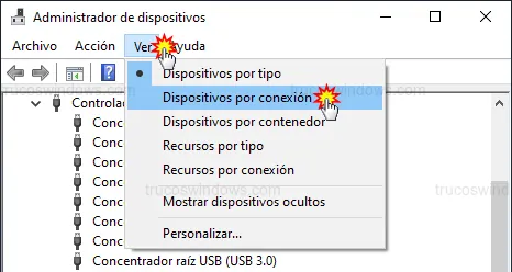 Por defecto, los dispositivos aparecen agrupados por tipo. Para ver exactamente qué periférico cuelga de qué puerto, cambia la vista: