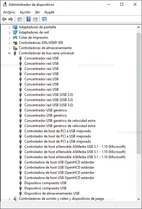 Localiza el Concentrador raíz USB que tenga dispositivos conectados (indicado por una flecha a su lado). Por ejemplo, donde tengas tu teclado o ratón: