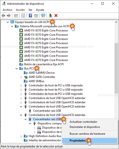 Navega a través de la ruta: Equipo basado en x64 ACPI > Sistema Microsoft compatible con ACPI > Bus PCI hasta localizar las controladoras USB.