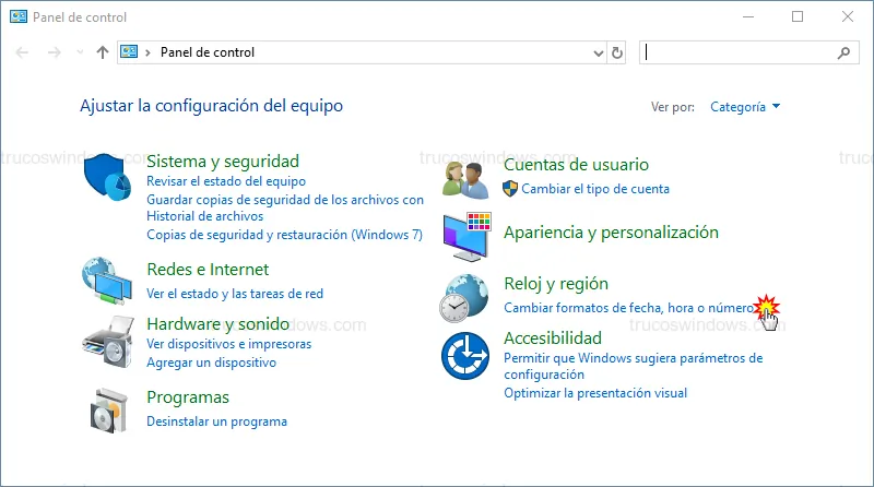 - Dentro del Panel de Control, busca la sección de Reloj y región y haz clic en Cambiar formatos de fecha, hora o número.