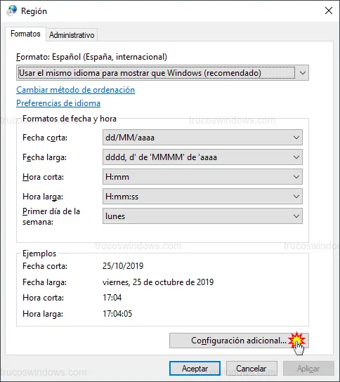 Fecha corta, selecciona la opción estándardd/MM/aaaa. - Haz clic en Aplicar y Aceptar.
