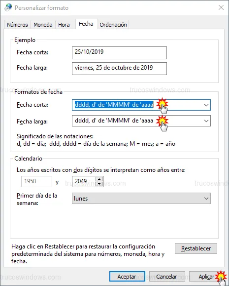 Fecha corta. Aquí es donde ocurre la "magia": para mostrar el día de la semana, puedes copiar el contenido deFecha largay pegarlo enFecha corta, o escribir manualmentedddd, d 'de' MMMM 'de' yyyy. - Pulsa el botón Aplicar.