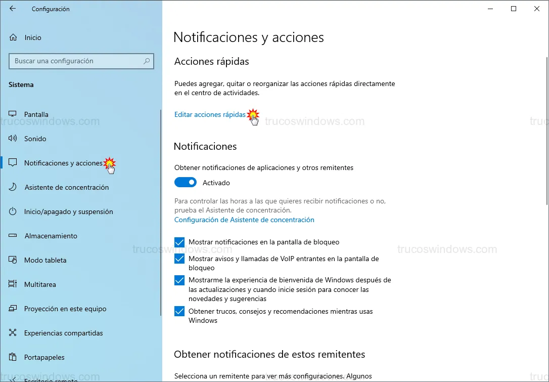 - En la columna izquierda, pinchamos sobre Notificaciones y acciones.
