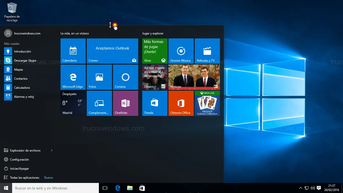 Puedes cambiar las dimensiones del menú de Inicio para que ocupe más o menos espacio en tu escritorio, igual que si fuera una ventana común: