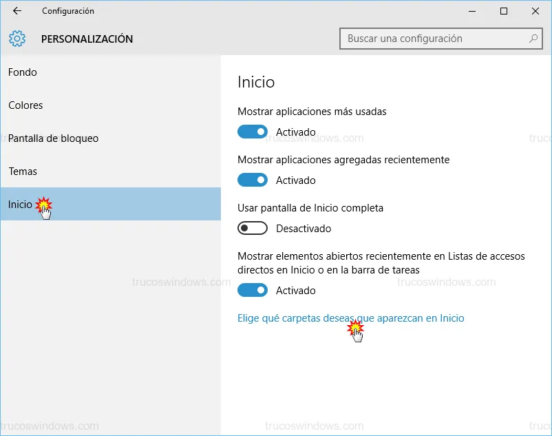 - Haz clic en Elige qué carpetas deseas que aparezcan en Inicio.