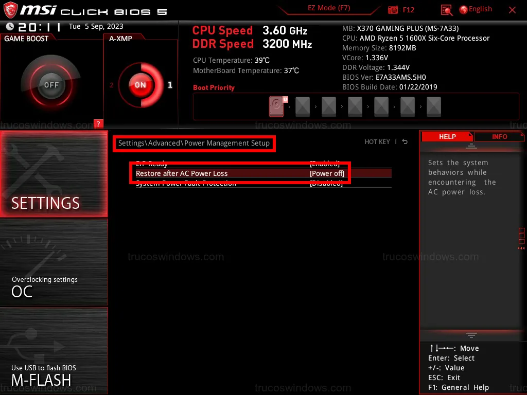 Consejo extra: Revisa en tu BIOS la opción Restore after AC power Loss. Si la pones en Power On, tu ordenador se encenderá automáticamente en cuanto detecte corriente eléctrica, útil si usas un enchufe inteligente.