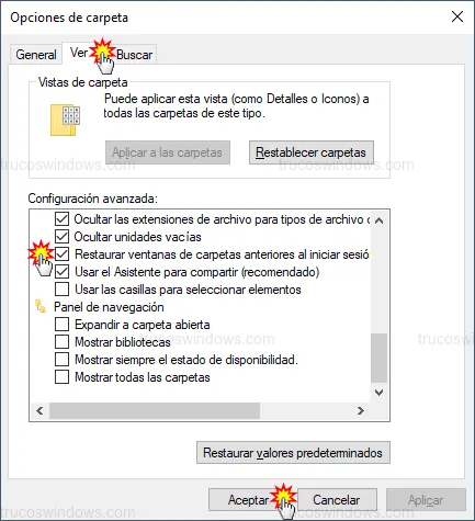 - Marca la casilla junto a la opción: Restaurar ventanas de carpetas anteriores al iniciar sesión.