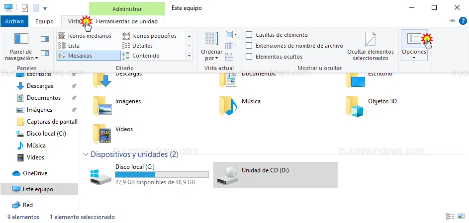 Acceso a las opciones del Explorador de archivos