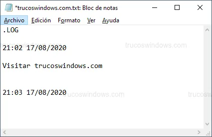 .LOG(en mayúsculas y con el punto inicial) en la primera línea. - Guarda el archivo. Al volver a abrirlo, verás la marca de tiempo automática bajo la cual puedes escribir.