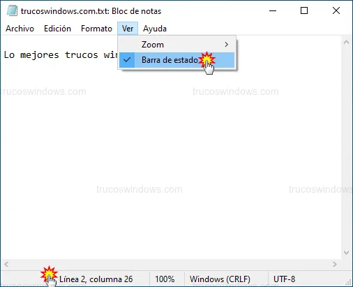 Si eres programador, saber en qué línea estás es vital. Activa la Barra de estado en el menú Ver para ver las coordenadas exactas de tu cursor en la esquina inferior derecha.