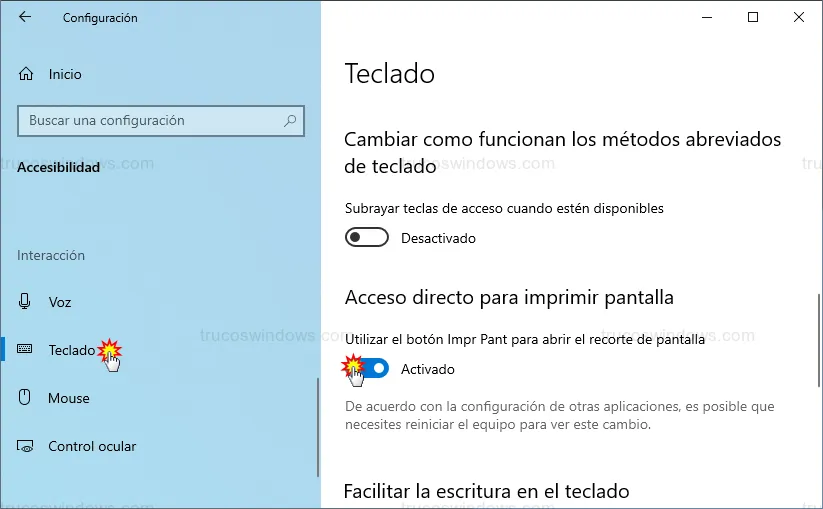 Acceso directo para imprimir la pantallay activa el interruptor Utilizar el botón Impr Pant para abrir el recorte de pantalla.