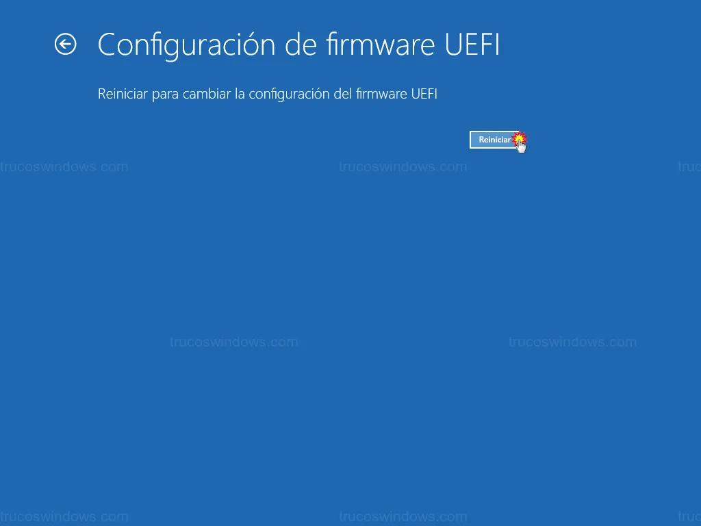 Nota: Si no ves la opción "Configuración de firmware UEFI", es probable que tu placa base sea antigua y utilice una BIOS tradicional o que Windows se haya instalado en modo Legacy.