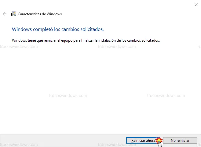 Ventana de confirmación de Windows 10 solicitando el reinicio para completar la instalación del componente