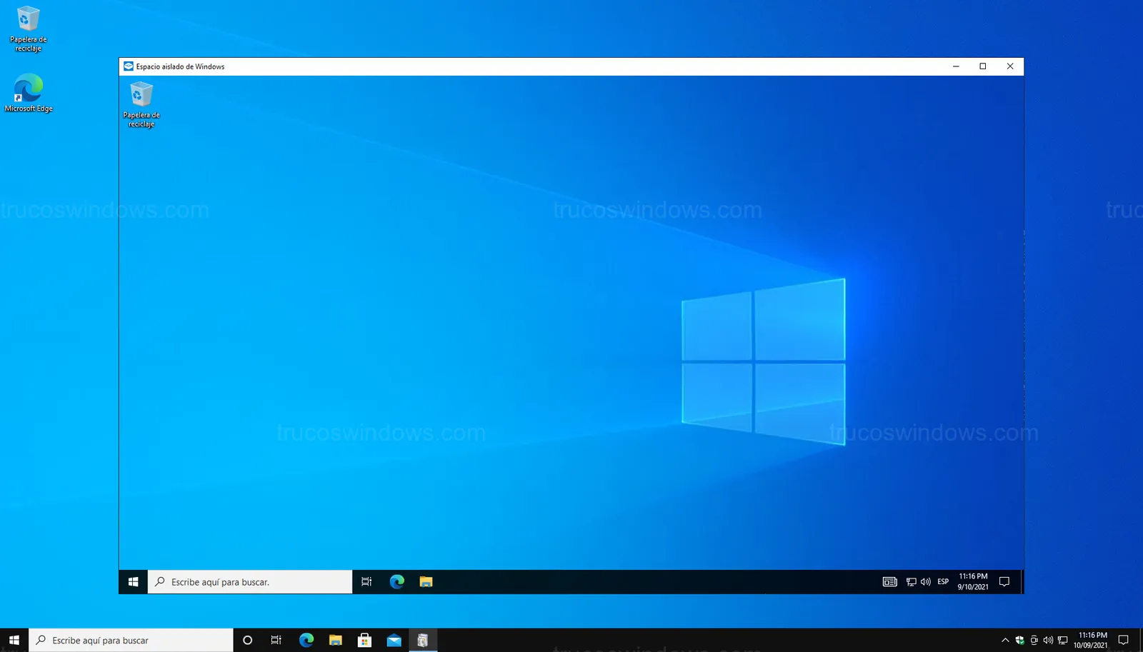 Vista final de Windows Sandbox ejecutándose en una ventana independiente dentro de Windows 10