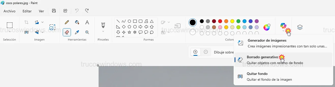 - Haz clic en el icono de Copilot y, a continuación, selecciona la opción Borrado generativo.